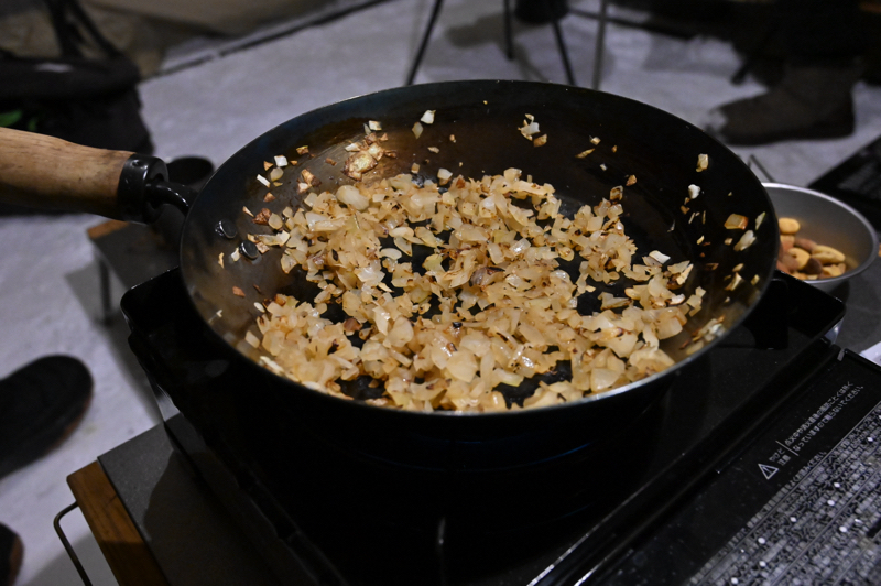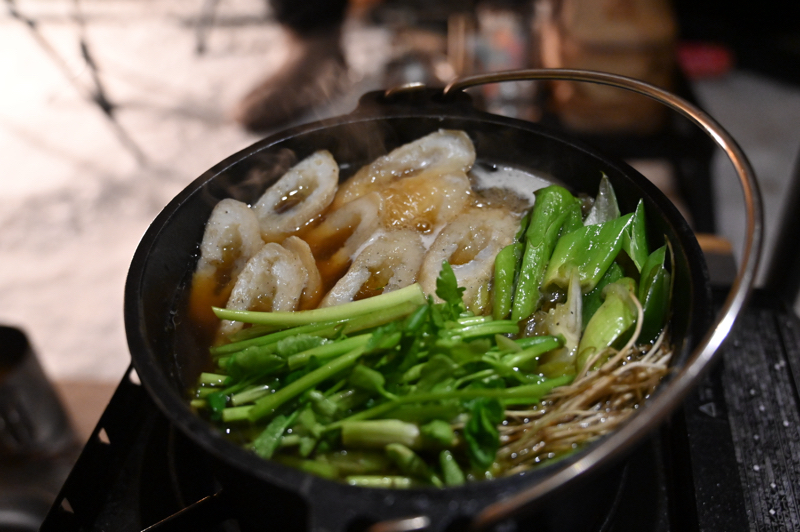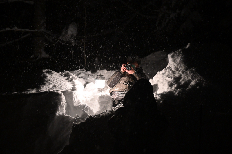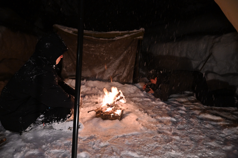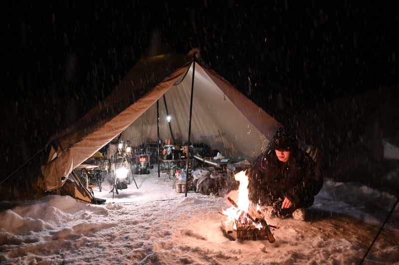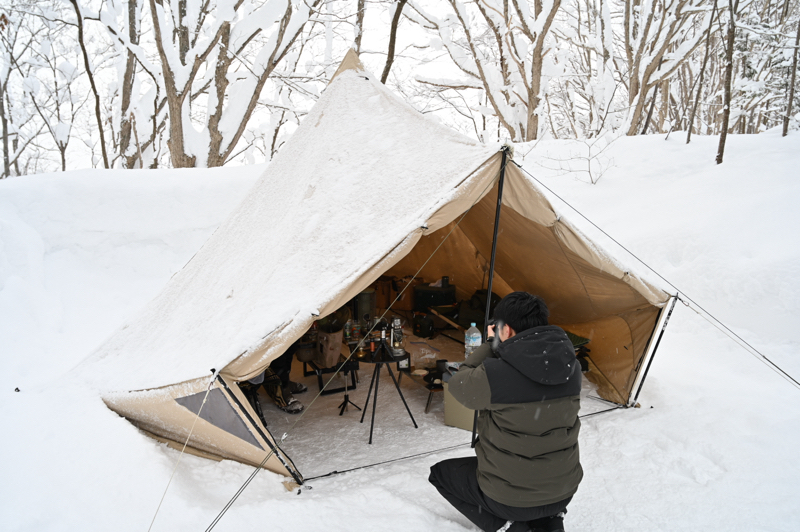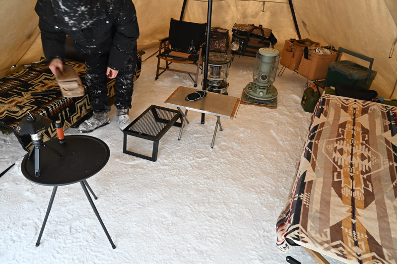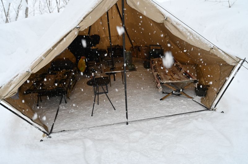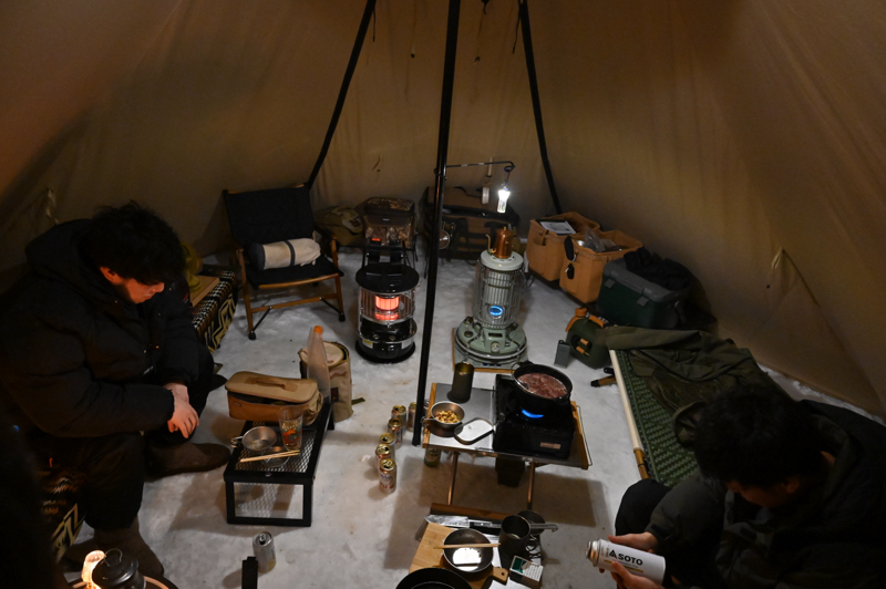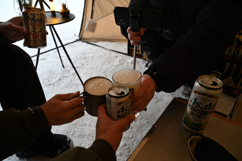 真冬大雪の北海道のテントの中で宴会スタートです。