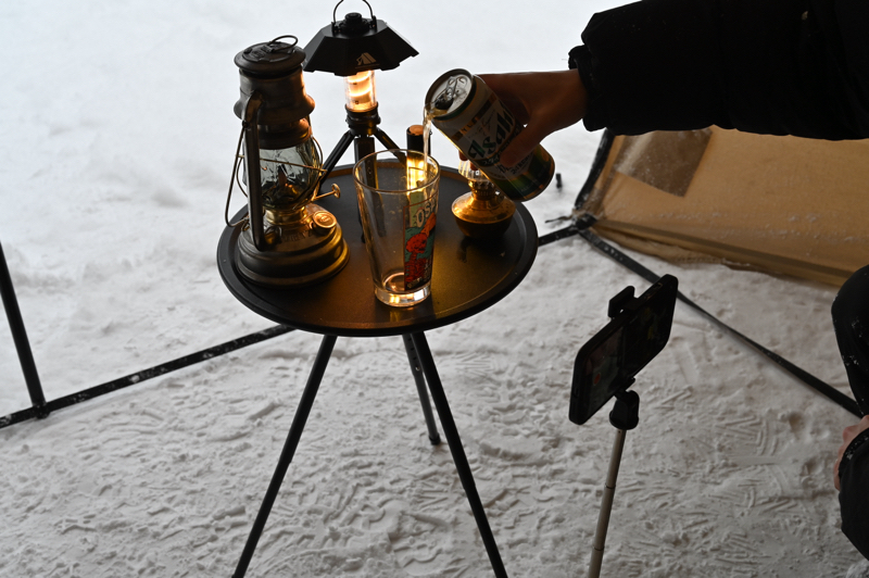 真冬大雪の北海道のテントの中で宴会スタートです。